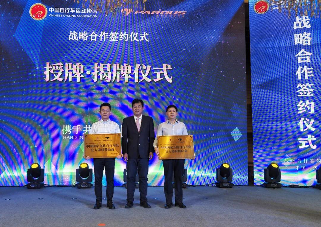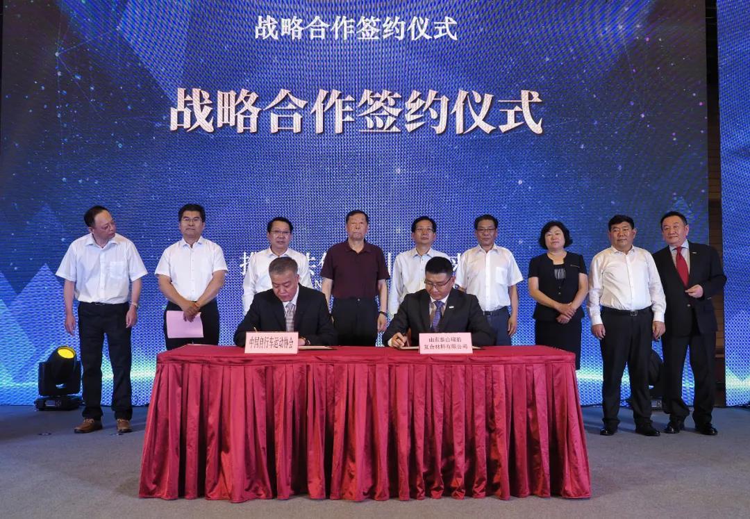 仪式上,中国自行车运动协会与中国·3003新葡瑞豹复合材料公司签订战略合作协议,标志着中国·3003新葡瑞豹正式成为中国国家队公路自行车、场地自行车这两个项目的器材赞助商和器材供应商。