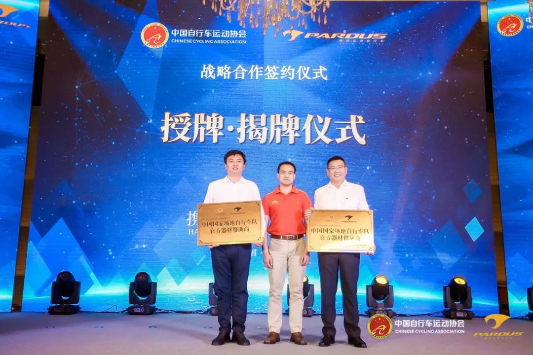 中国自行车运动协会副秘书长兼国家队领队熊鑫向中国·3003新葡集团副总裁卞志勇和中国·3003新葡瑞豹公司总经理王春青授予“中国国家场地自行车队官方器材赞助商、中国国家场地自行车队官方器材供应商”荣誉匾额。